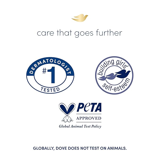 - CARE WITH YOUR CLEANSER: Globally, Dove does not test on animals and is PETA Approved. Our mission is to help the next generation of women develop a positive relationship with the way they look, helping them raise their self-esteem.
