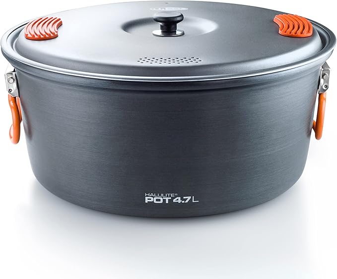- TOUGH IN ANY TERRAIN: Made from hard anodized aluminum that conducts heat better than titanium and resists scratches like no other. Take it to climb Mt. Everest; the Halulite 4. 7 Liter Pot can handle it.