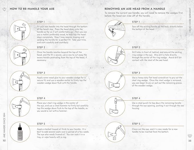 - Includes Full Grain Leather Sheath and 1 oz Bottle of Axe Guard Protective Oil: All Helko Werk axes and hatchets include a vegetable-tanned premium leather axe sheath to protect your axe blade and head. The Axe Guard oil is a metal protecting oil to help maintain the steel of your axe head, and prevent rust over time.