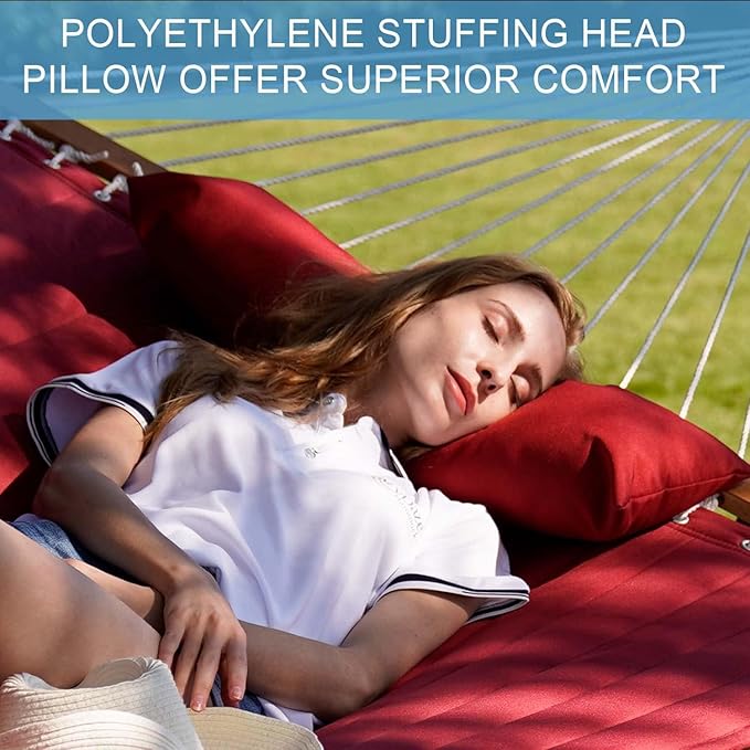 - SUPER COMFY: The double-layered quilted polyester with inner polyester padding and a polyethylene stuffing head pillow offer superior comfort. This quilted hammock can give you a cloud-like comfortable experience. Lying on it is like being in a warm embrace. No matter it's in summer or winter, this hammock will always be your first choice for relaxation.