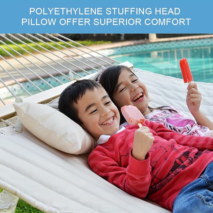 - SUPER COMFY: The double-layered quilted polyester with inner polyester padding and a polyethylene stuffing head pillow offer superior comfort. This quilted hammock can give you a cloud-like comfortable experience. Lying on it is like being in a warm embrace. No matter it's in summer or winter, this hammock will always be your first choice for relaxation.