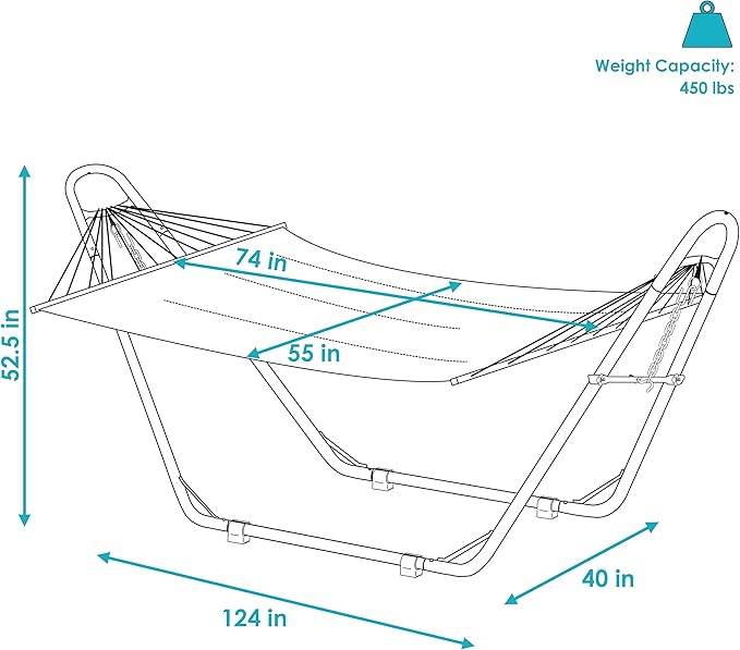 - EXTRA SPACE FOR TWO PEOPLE: This large freestanding quilted hammock with stand measures 125.5" W x 55" D x 52.5" H. The stand dimensions are 124" W x 40" D x 52.5" H, and it weighs 25 lbs. The hammock measures 125.5" W x 55" D x 1" H and weighs 11 lbs. With the included attached chains and hardware, this stand will fit hammocks ranging from 9.5 feet to 14 feet long. The weight capacity is 440 lbs. The overall weight of the hammock and stand is a combined 36 lbs.