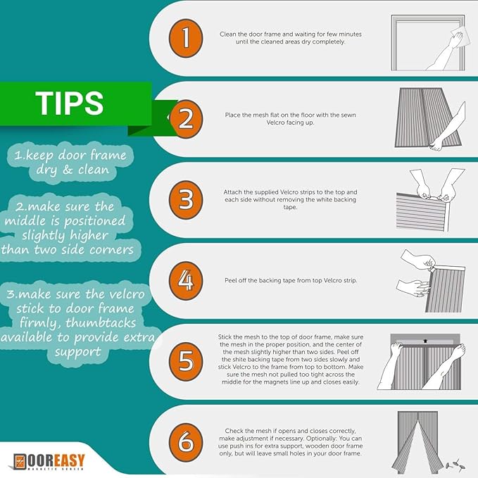 - ·FULL FRAME fastener-full length fastener loop sewn to the top and both sides magnetic door curtain type. Washable for frequent usage. Seamless seal along the screen curtain 3 sides. Installation and removal becomes simple. Roll of fastener hook with premium back tape included in the accessories. Holding the magnetic screen door to the wall fast and no dirty residue left upon the door frame. No metal bracket needed to support, no drilling a hole on your clean, flat and white wall.