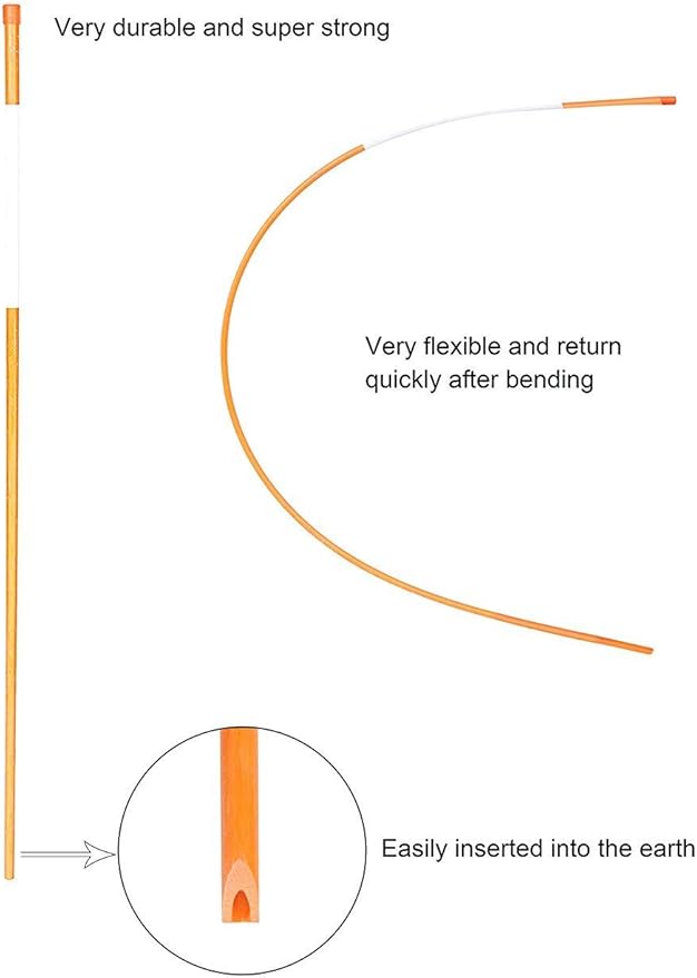 - 20 pack hollow poles, 1/4 Inch diameter by 60 Inch length, orange; Reflective tape is silver grey, 10 inch long