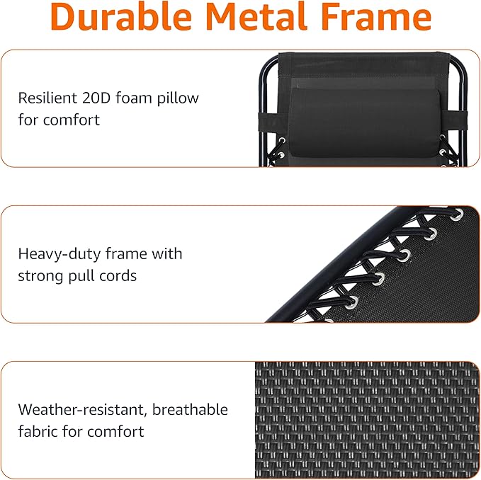 Amazon Basics Outdoor Patio Zero Gravity Lounge Chair with Pillow, Folding Reclining and Textilene Adjustable, Folding Lounge Lawn Chairs for Outside, 26", Black