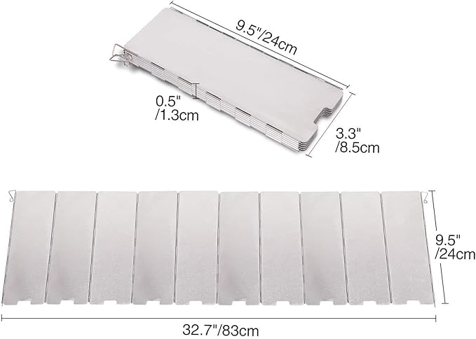 - TALL & LARGE: Folding windscreen camping stove (unfold size) 32.7"x9.5"/83x24cm. (pack size) 9.5"x3.3"x0.5"/24x8.5x1.3cm. Enough to provide wind protection and big enough for both gas backpacking stoves as well as wood burning stoves