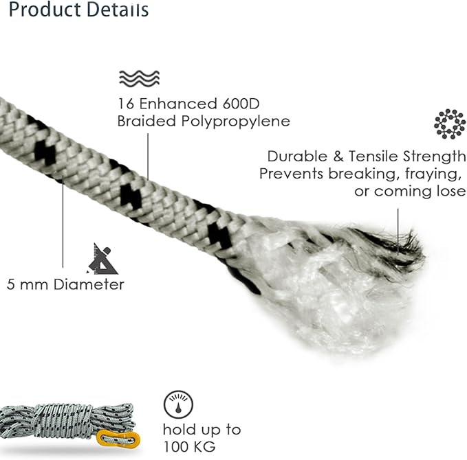 - 【Extremely Strong Camp Lines】 These tent cords consist of 16 enhanced 600D braided polypropylene wires that makes its strength and durable, not easy to break, anti-tear. Support the tent, canopy, shelter, steady even in the heavy windy weather. Load bearing 220 lbs for all general purpose activities