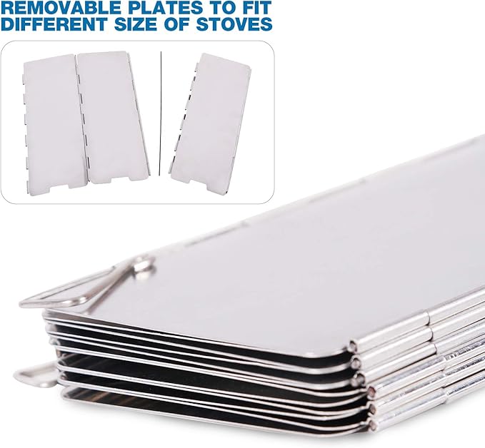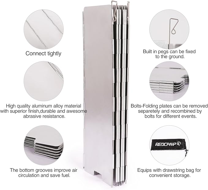 - STURDY: REDCAMP stove windshield has 12 removable plates to fit different size of stove and high quality aluminum alloy material with superior finish, durable and abrasive resistance