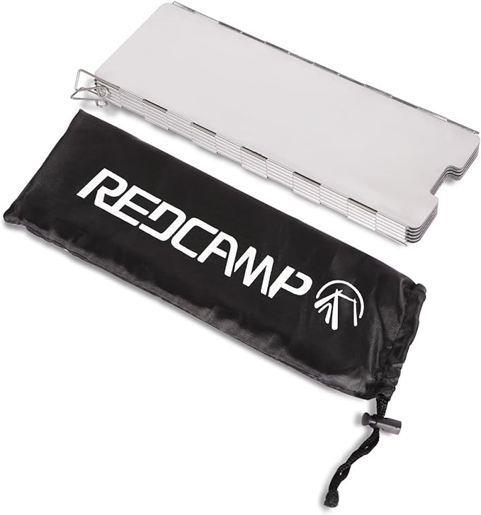 - LIGHTWEIGT & COMPACT: REDCAMP aluminum windscreen has a drawstring bag for convenient storage so that it take up little space. Packing weight of the foldable stove windshield: 0.66lbs (0.3kg)