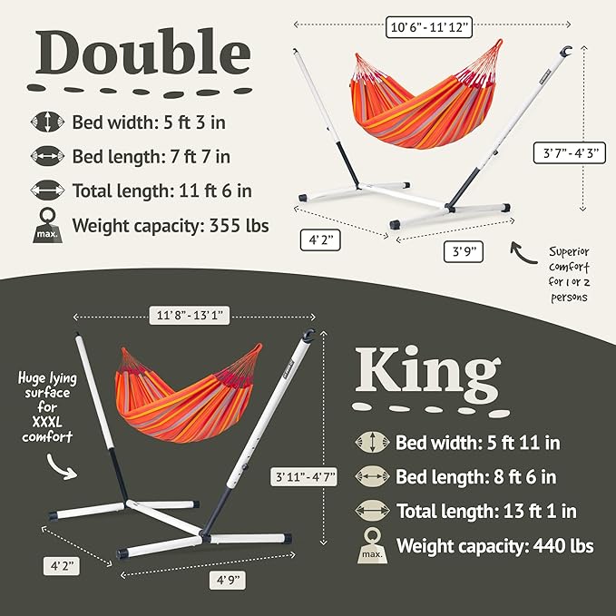 - Ideal Sizes: Double for 355 lbs capacity; King for 440 lbs, perfect hammock for 2 persons.