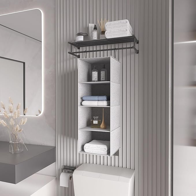Hanging Closet Organizer, Easy Mount Collapsible 4-Shelf Camper Closet Wardrobe Hanging Storage Shelves, Folded Clothes Towels Handbag Shoes Accessories Storage, Linen Cloth, Gray