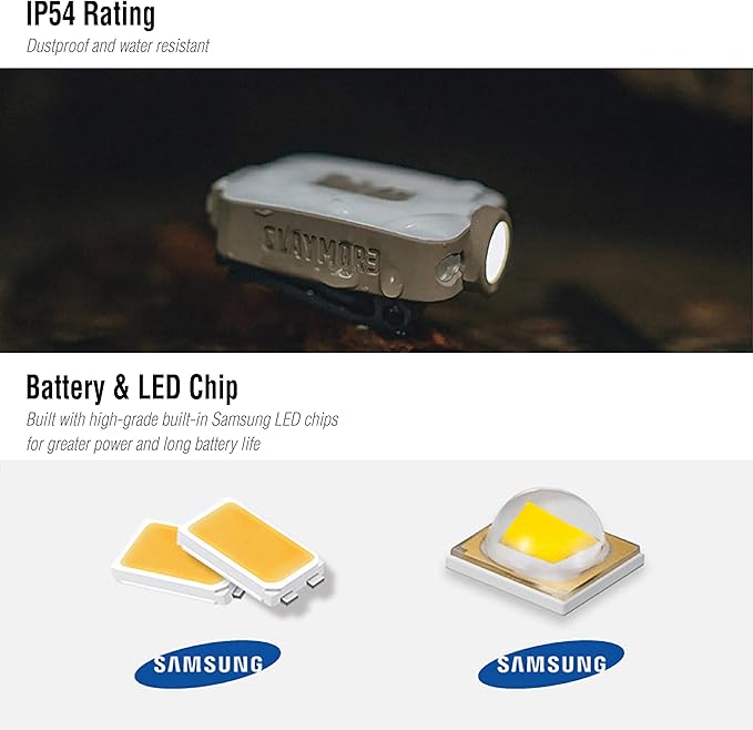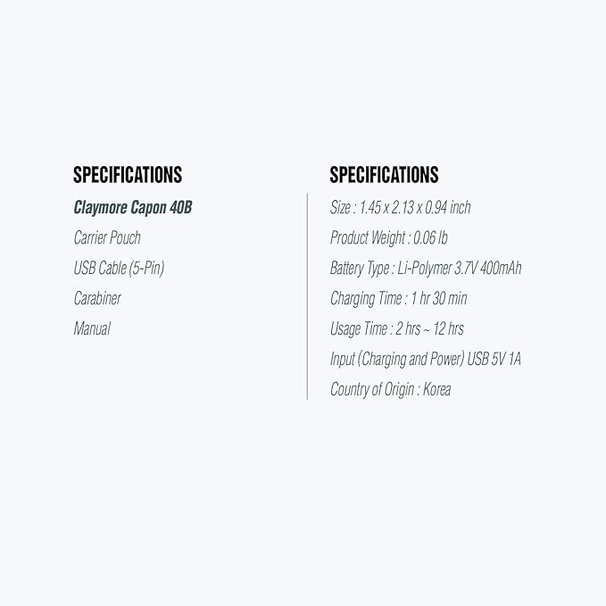 - CLAYMORE CAPON 40B (RED) - Ultra-lightweight clip-on cap light, weighing only 1.02oz with a 400mAh battery, offers convenient, hands-free illumination. It's ideal for outdoor activities, easily attaching to caps, helmets, and more, and features a powerful LED that's rechargeable and adjustable up to 180° for various angles.
