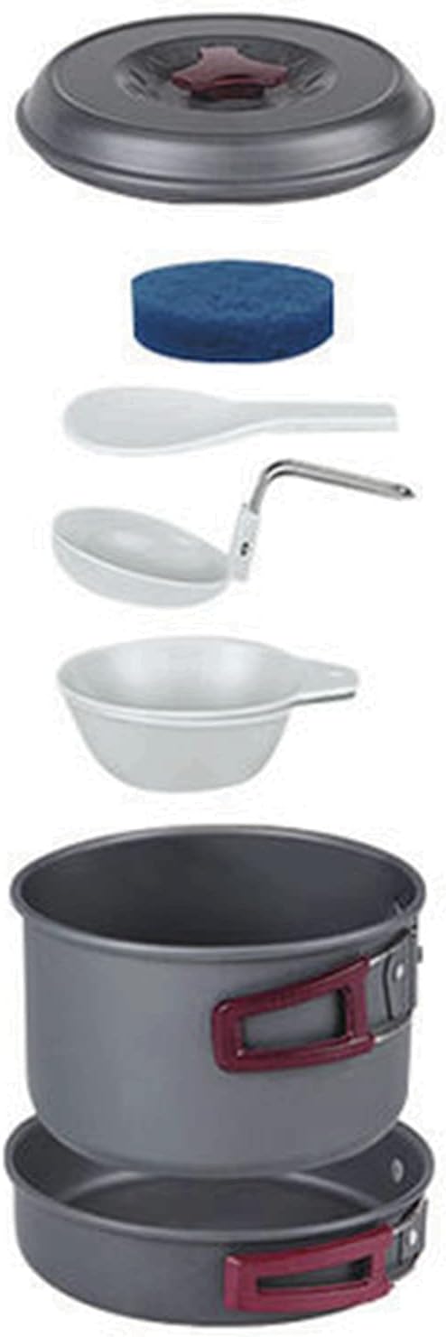 - Complete 1 Person Cookware Set: Our backpacking cooking set includes 1 pot with lids,1 frying pan, 2 BPA free bowls,1 BPA Free soup spoon, 1 rice ladle, and 1 cleaning sponge. You can enjoy delicious food with your lover anywhere. Best money ever spent.