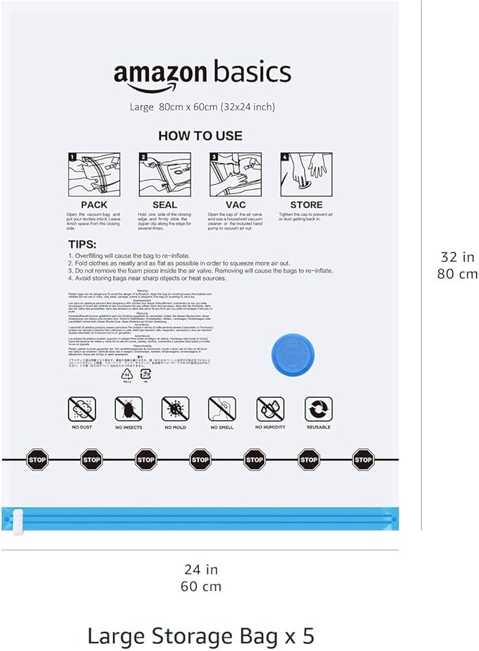 Amazon Basics Vacuum Compression Space Saving Storage Bags with Hand Pump, Large, Pack of 5, Clear