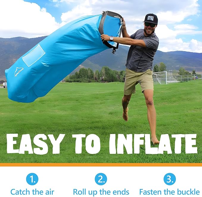 - EASY INFLATION DESIGN -- No pump required for AlphaBeing air lounger. Just a few scoops of air and this inflatable lounger is ready to hangout in. This is a must-have for any BBQ, Pool Party, Beach, Hike, Concert, or Camping Trip. Folding to 12"x 8"x 4"and fitting in its own carrying bag with shoulder strap, this air sofa is ready to be taken anywhere with you.