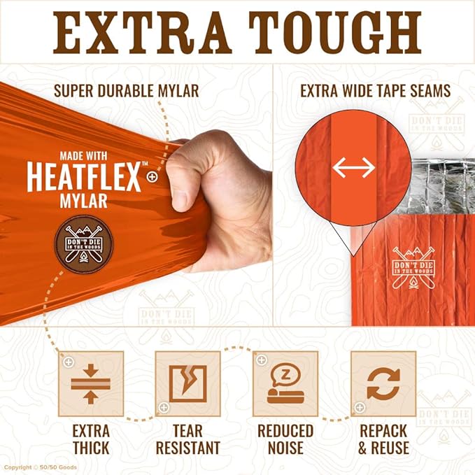 - TOUGHEST MYLAR SLEEPING BAG ON EARTH – Our tear-resistant, extra-thick HeatFlex mylar is stronger and more flexible than ordinary space blanket mylar. We’ve added a hood section to protect your head and reinforced tape seams to create a durable, reusable survival bivy you can use alone or to enhance your existing sleeping bag.