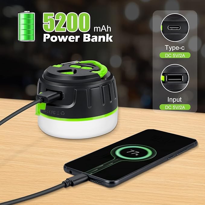 - ✅【5200mAh Power Bank】Rechargeable lantern is equipped with a high-quality 5200mAh battery, this Led lantern not only provides reliable illumination but also serves as a convenient emergency power supply for charging mobile devices, providing up to 150 hours of low-brightness illumination for extended outdoor adventures.