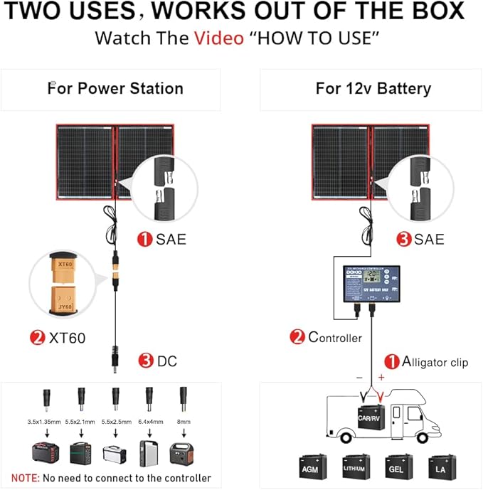- 【WIDE BATTERY & POWER STATION COMPATIBILITY】 Works with 12V AGM, Gel, and LiFePO4 batteries as well as most portable power stations. For MPPT-equipped units, connect directly to the DC/solar input and skip the included PWM.
