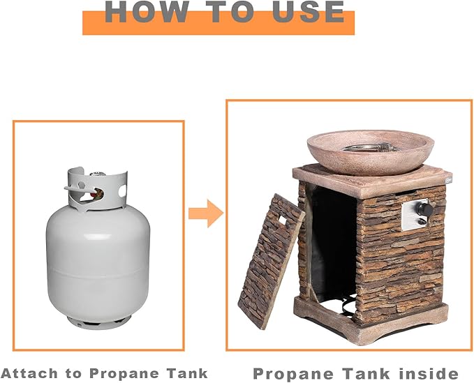- π₯γ Stylish Comfortγ: The elongated cubic pedestal base can conceals an standard 20lb propane tank ( not included) and features a rustic stacked brown ledge stone appearance with a faux rose marble fire bowl on top. The frame is a sturdy, fire retardant magnesium oxide with a stainless steel burner bowl, low maintenance and resistant to heat. Lights with the push of a button and flame intensity is controlled by an adjustment knob.