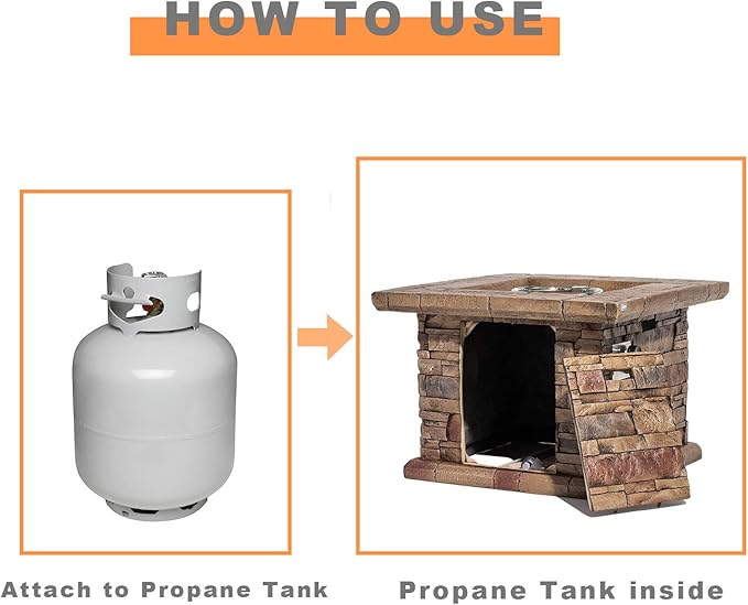 - š„ć Gather Round the Fire ć: The cubic table base can conceal an ordinary 20lb propane tank ( not included) and features the classic stacked brown ledgestone mantle appearance. The tabletop extends further providing a perfect place for cocktails and appetizers. All built to last from sturdy, fire retardant magnesium oxide with a stainless steel burner bowl, low maintenance and resistant to heat. Lights with the push of a button and flame intensity is controlled by the turn of a knob.