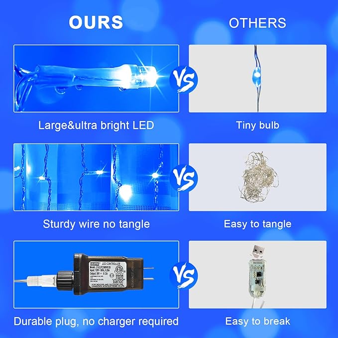 - Customer Team: If there are any problems with our indoor-outdoor blue Christmas curtain lights, please get in touch with us and we will return or refund you, your satisfaction is our unremitting pursuit