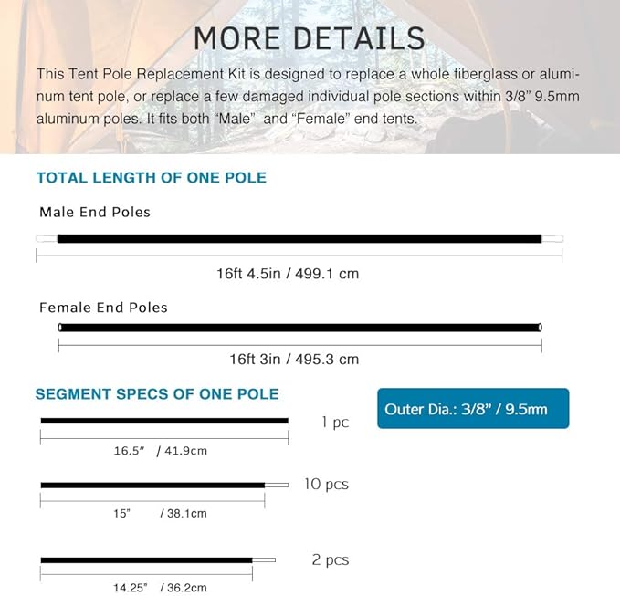 - FIT MALE & FEMALE ENDS - Not all poles are MALE ends. You could assemble our tent pole repair kit to make it either MALE or FEMALE.