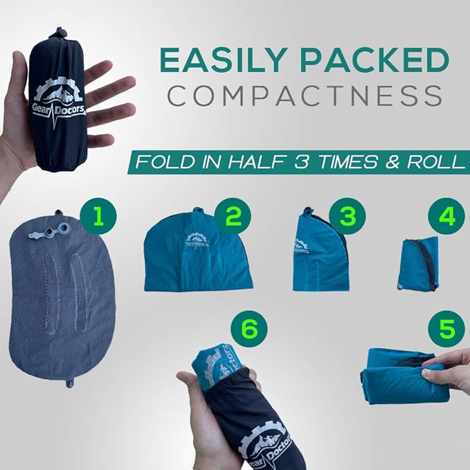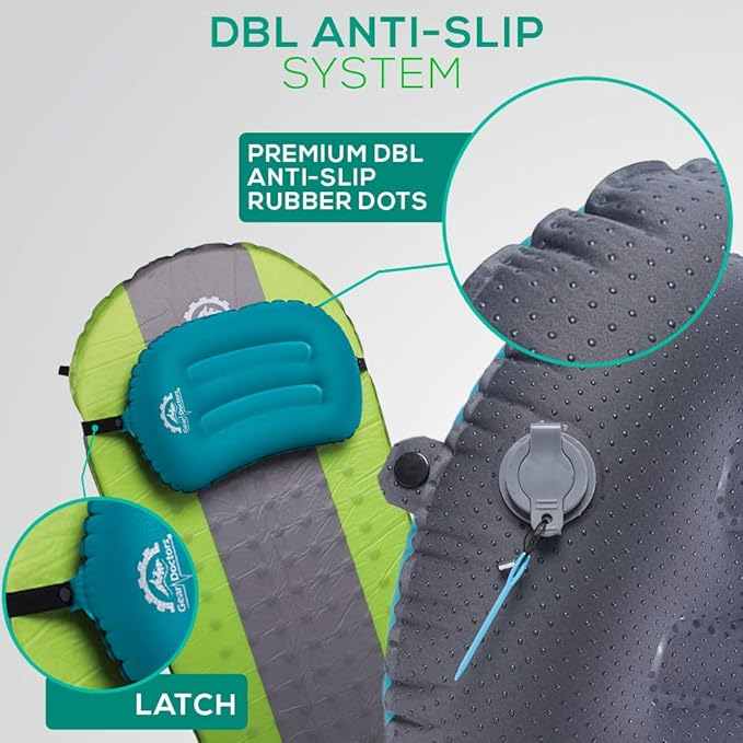- ๐๐จ๐ฎ๐๐ฅ๐ ๐๐ง๐ญ๐ข-๐๐ฅ๐ข๐ฉ ๐๐ฒ๐ฌ๐ญ๐๐ฆ: Rubber dots at the bottom fabric make Gear Doctors Camping Pillow stable on any Nylon , Polyester or other slippery sleeping pad fabric , If that is not enough you can use the detachable latch to lettarly tie the pillow to your sleeping pad , or even any car/ office chair , No more sliding noises or waking up to readjust your pillow
