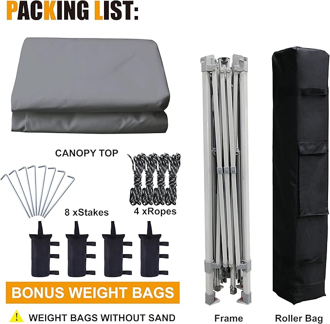 - 【PARTS INCLUDED】Fully assembled powder-coated steel frame,CPAI-84 Flame retardant silver coated canopy top,600D heavy stock wear resistant roller bag,4Xsand bags,8Xstakes and 4X ropes. If you have anything about our products, We are ready to help you.