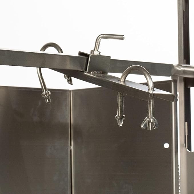 - DUAL PRONG SPIT ROD: This rotisserie features a durable dual-prong spit rod that holds whole pig, turkey, pork shoulder, and more. With a leg bracket, spine fork, and three adjustable tiers, it ensures juicy, tender results. Constant rotation drains fat into a removable stainless steel drip pan for healthier flavor.