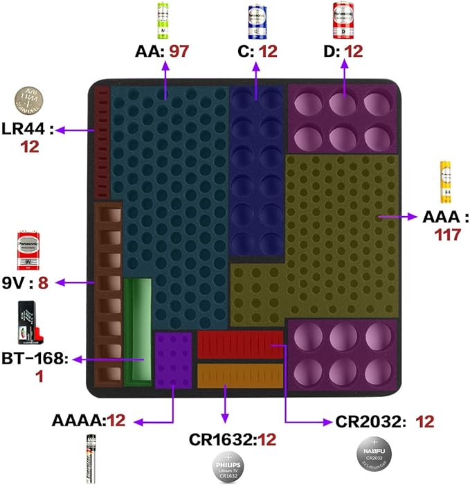 - For More Type Batteries: It can hold 97*AA, 117*AAA, 12*C, 12*D, 8*9V, 12* AAAA, 36 *button type battery( 3v lithium - LR 44, CR 2032,CR 2016,CR 1632, CR 2025.1* battery tester, total 297 batteries.