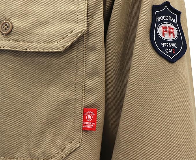 • FR MATRIALS LIGHT WEIGHT:Light Water/Rain Repellent and Oil/Stain Resistant 6.25oz Cotton Twill FR Treated,FR Buttons,FR Sewing Threads!Clear FR Tag on arms and bottom front.More FR info On Neck Tag about UL Certification.We Attached A Small Sample Inside Package For Customers Simple FR Try