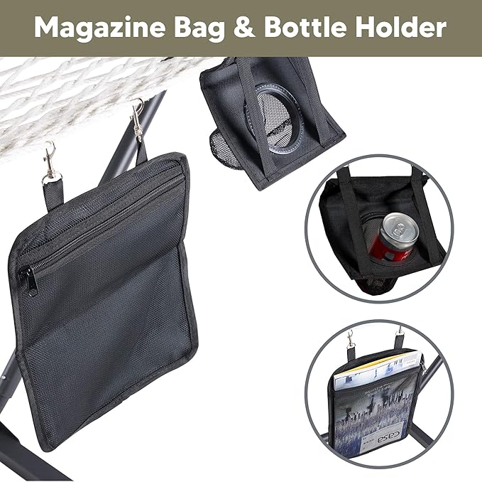 SUNCREAT Cotton Rope Hammock for Two People with Hardwood Spreader Bars, Quilted Fabric Pad & Detachable Pillow, Extra Large Hammock with 12 FT Steel Stand, Ipad Bag & Cup Holder, Green&Beige