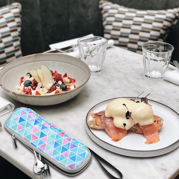CM Reusable Portable Travel Tableware Carrying Bag Storage Case Cutlery Flatware Organziers for Straw Spoon Fork Chopsticks Utensil Holder (Fade in Blue Triangle Pattern)