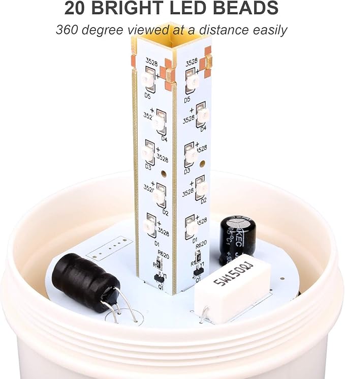 - Includes an internal audible alarm buzzer (hi-pitched tone) of 100+dB (at 1m) that is synchronized with the light operation for conspicuous effect