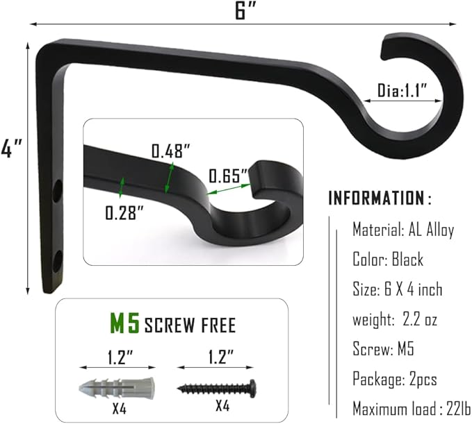 - ?�EASY TO INSTALL?‘This package includes 2 plant hooks, 4 screws and 4 wall anchors, and maximum load up to 22 lb. Each screw is a standard M5 screw, 1.2 inches long. All you have to do is screw the screws into the wooden fence posts, deck posts and even the interior walls. It looks great in a variety of different environments.