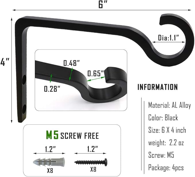 - ?�EASY TO INSTALL?‘This package includes 2 plant hooks, 4 screws and 4 wall anchors, and maximum load up to 22 lb. Each screw is a standard M5 screw, 1.2 inches long. All you have to do is screw the screws into the wooden fence posts, deck posts and even the interior walls. It looks great in a variety of different environments.