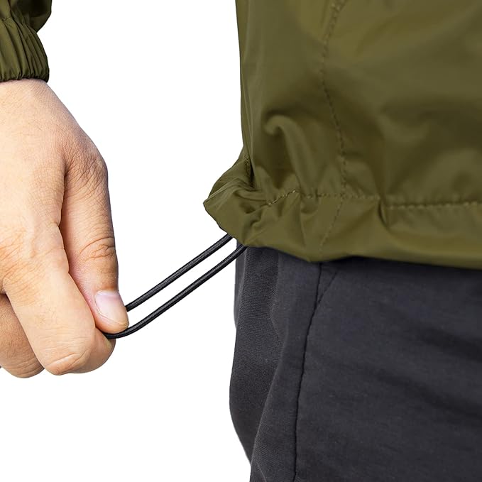 - Elastic cuffs, adjustable drawcord hood and hem elastic rope prevent rain from getting in while providing warmth