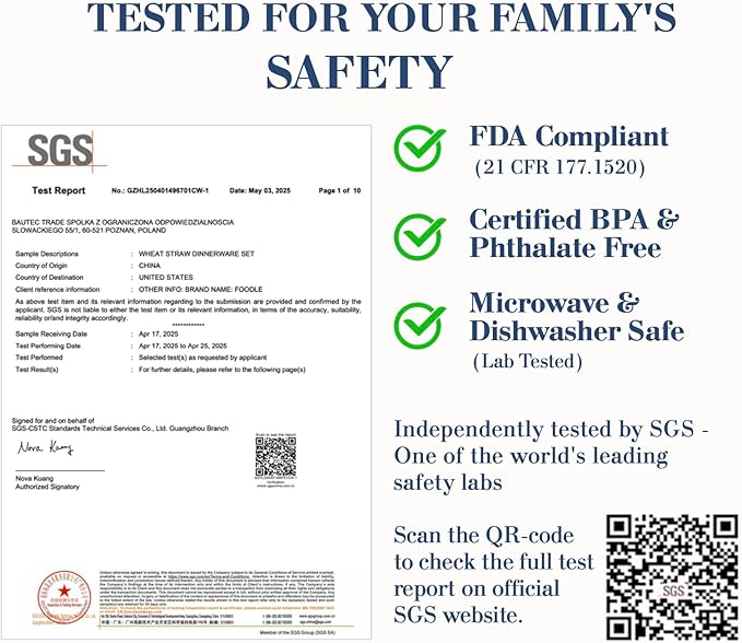 - TRUSTED MATERIALS, CERTIFIED SAFETY: Our wheat straw dinnerware is crafted with premium, non-toxic materials and lab-tested for your peace of mind. FDA compliant (21 CFR 177.1520), BPA-Free, Phthalate-Free.