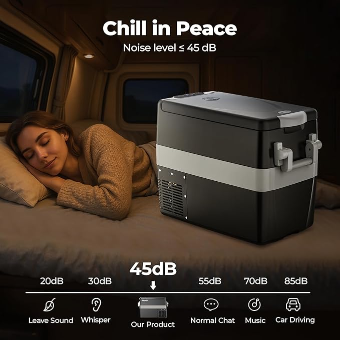 - 45dB Low Noise & Battery Protection: The truck freezer is designed to lower noise to make sure you have a good sleep after long driving. The RV fridge/freezer is equipped with a 3-level battery monitor to prevent itself from draining your vehicle's battery