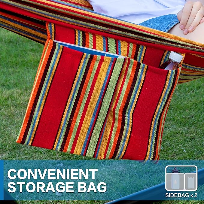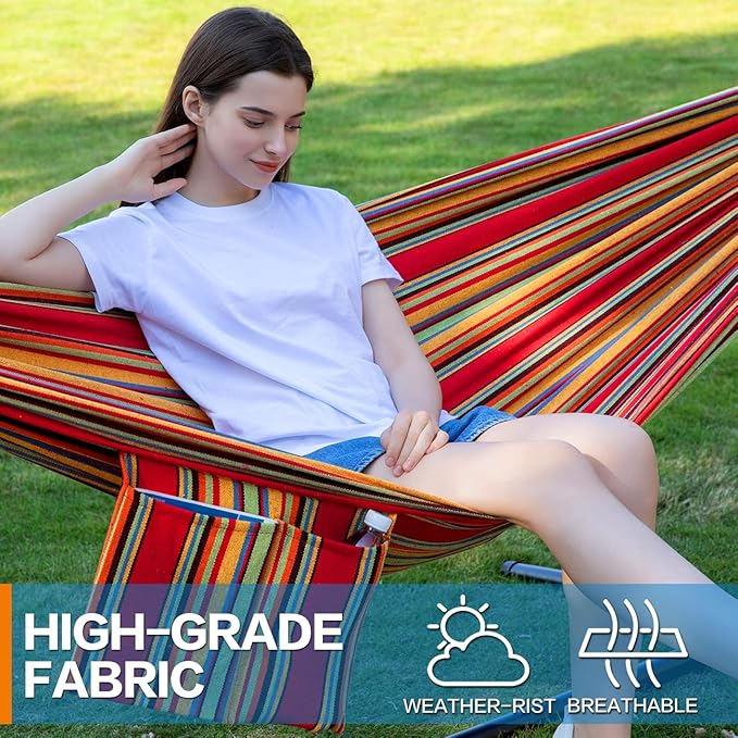 - DOUBLE HAMMOCK , It has the stronger and durable steel stand, a hook with a metal buckle. 450-pound weight capacity easily accommodates up to two people at once