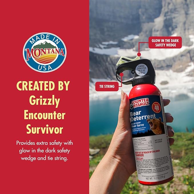 - Range & Duration: The 10.2 oz canister of bear repellent spray reaches 40 feet and offers an 8-second spray, making it ideal for hiking survival kits