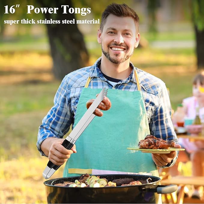 - 【EXTRA-THICK & QUALITY MATERIAL】--- This professional BBQ grilling set made of quality stainless steel material which are extra thick and hold up well for constant grilling practices, Will withstands heat, rust and cracks, Every item in this kit is substantial, sturdy and durable, The handles are elongated for a safe BBQ. They are long enough to keep a safe distance from fire and do the job. All the barbecue tools are well made and made to last