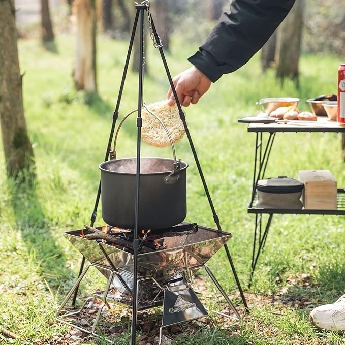 - 【Compact & lightweight】CAMPINGMOON's Campfire Tripod has aluminum frame and stainless steel chain. Weighs just 1.1 pounds, making it easy to carry and set up. It is also designed to be collapsible, so it can be easily packed away when not in use.
