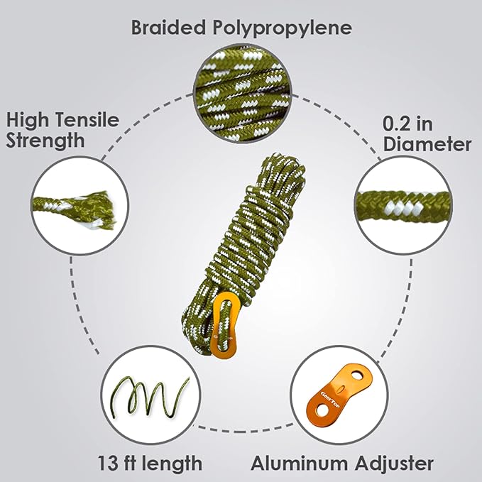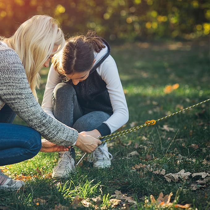 - 【Extremely Strong Camp Lines】 These tent cords consist of 16 enhanced 600D braided polypropylene wires that makes its strength and durable, not easy to break, anti-tear. Support the tent, canopy, shelter, steady even in the heavy windy weather. Load bearing 220 lbs for all general purpose activities