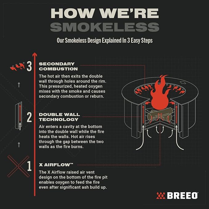 - INNOVATIVE AIRFLOW TECHNOLOGY - Breeo’s patented X Airflow technology feeds oxygen to the fire, allowing it to ignite quickly and burn efficiently. This technology helps minimize smoke and provides a superior outdoor fire experience.