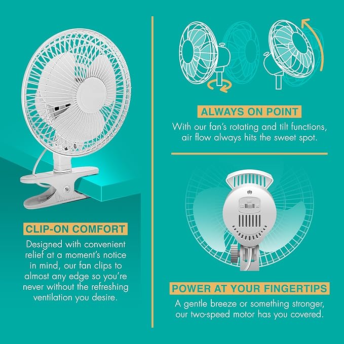 - CONVENIENT CLIP ON DESIGN: Perfect for dorm rooms, grow rooms/tents, green houses and even offices desks or beds, the Joey'z clip on fan is designed to bring air flow where ever you need it. Clip it on furniture, windowsills, and more for ultimate cooling convenience.
