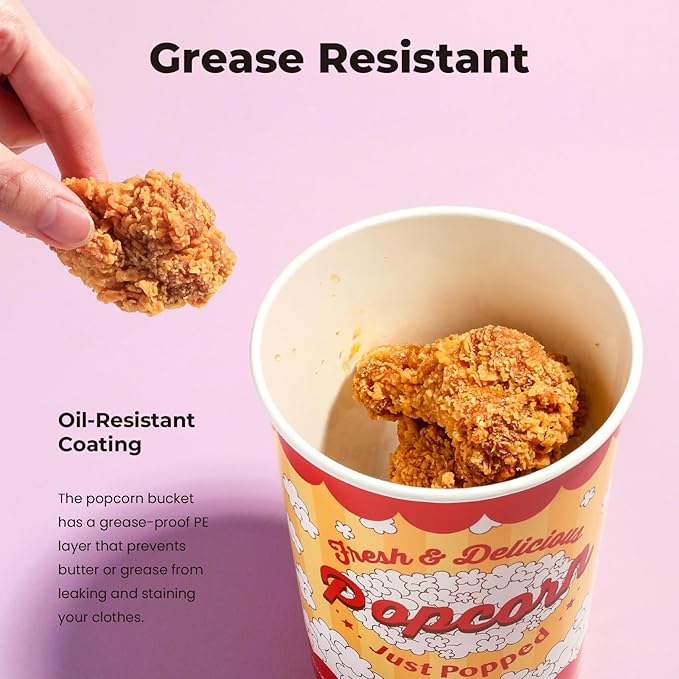 - Grease & Leak Proof - Our paper buckets are lined with a grease-proof coating on the inside, which effectively prevents grease from leaking through. Popcorn containers disposable are perfect for serving hot food without the worry of butter getting on your fingers, clothes, or pants.