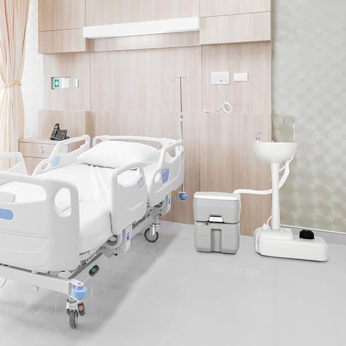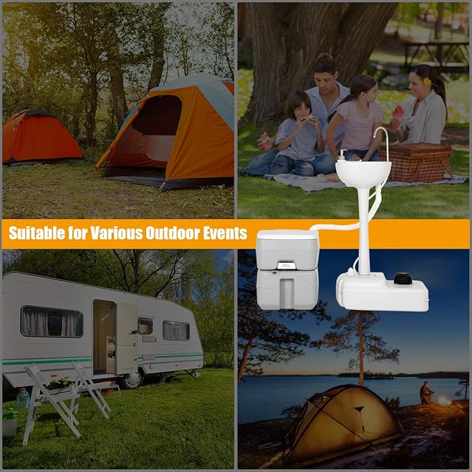 - Enjoy Comfort Anywhere : This portable toilet kit lets you enjoy the comfort of standard toilet outdoors. Compact design won't take up too much room or burden you too much. Bottom wheels of wash sink and handles of toilet make it easy to move anywhere.