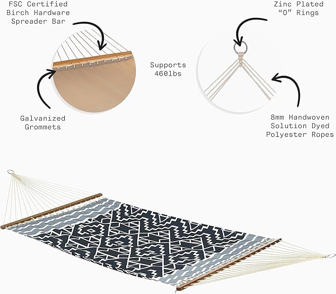 Fab Habitat Tribal Recycled Polyester Hammock - Kilimanjaro - Black - Indoor/Outdoor, Quick Dry, 2 Person 460 lbs Capacity - Patio, Poolside, Backyard, Garden, Beach, Balcony - 12-14 ft Adjustable