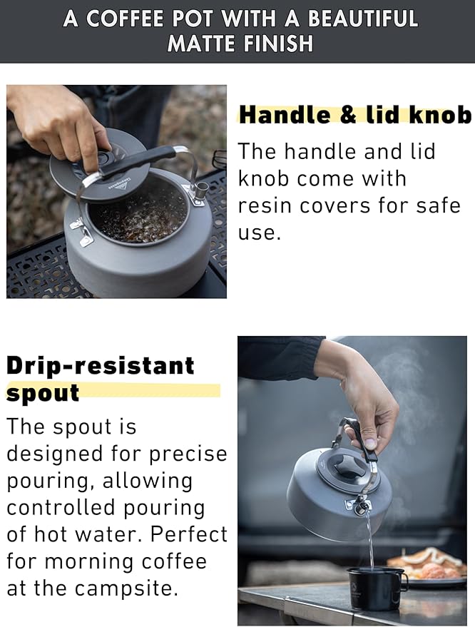- This ultralight camping coffee kettle processed with a hard alumite treatment with corrosion resistance, which is sturdy and hard to get corrosion.